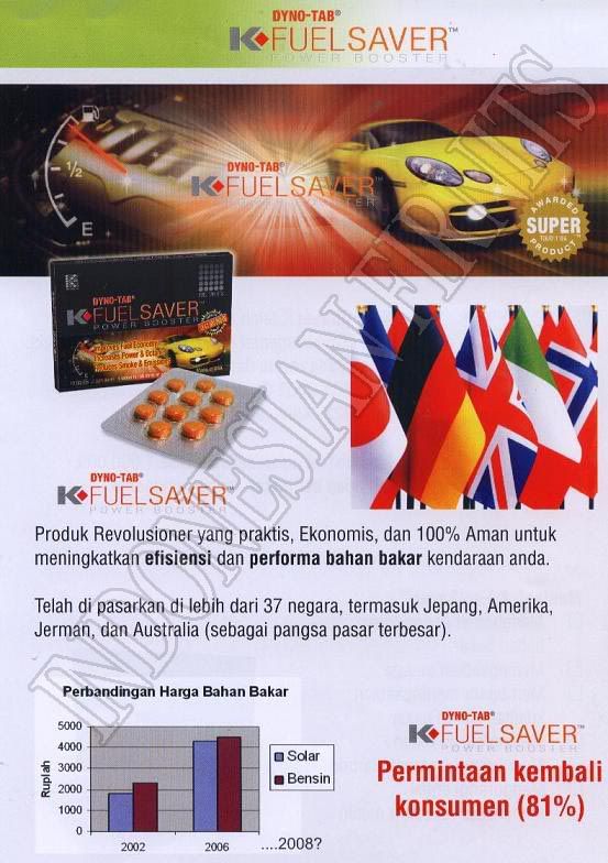 K-Fuel Saver adalah produk dari Amerika, merupakan aditif bahan bakar multi fungsi dalam bentuk tablet. Cocok untuk mesin bensin dan diesel K-FuelSaver larut sempurna dalam bahan bakar, membantu menghemat bahan bakar, meningkatkan tenaga dan mengurangi emisi.