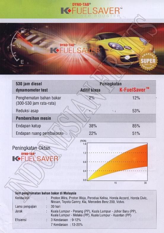 • Pada suatu perawatan untuk pertama ( 1 K-Fuel Saver® yang dibandingkan ke 1 botol dari cairan), rata-rata diatas, K-Fuel Saver® adalah 44% lebih hemat, dari produk lainnya. Harga terjangkau, Rp. 120.000,- Per Box