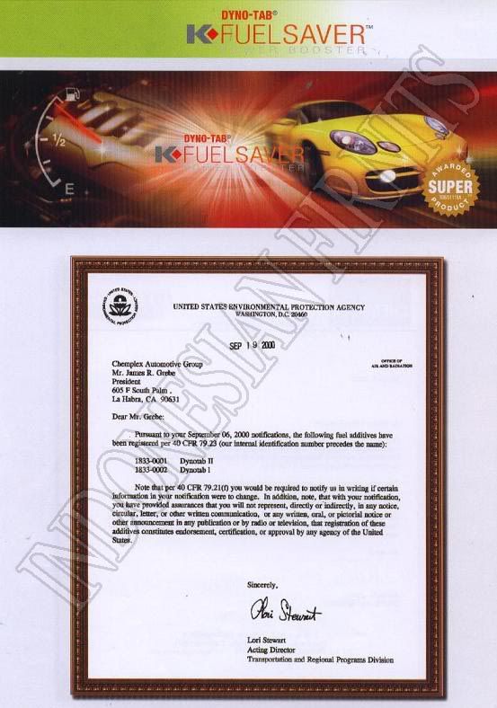 K-Fuelsaver telah di uji oleh pihak berwenang di Amerika & Eropa. Test tersebut membuktikan bahwa sepenuhnya aman untuk mesin bensin dan solar. K-Fuelsaver tidak akan merusak mesin, sistem bahan bakar, sumber tenaga dan alat pengukur polusi lainnya. Tidak akan membatalkan asuransi, telah terdaftar di *EPA dan telah di gunakan secara luas di seluruh dunia.